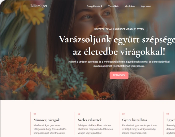 Egy virágbolttal rendelkező ügyfelünk számára egy letisztult bemutatkozó weboldalt készítettünk, amely segít a helyi vásárlók megszólításában, miközben tükrözi az üzlet hangulatát és vizuális stílusát.