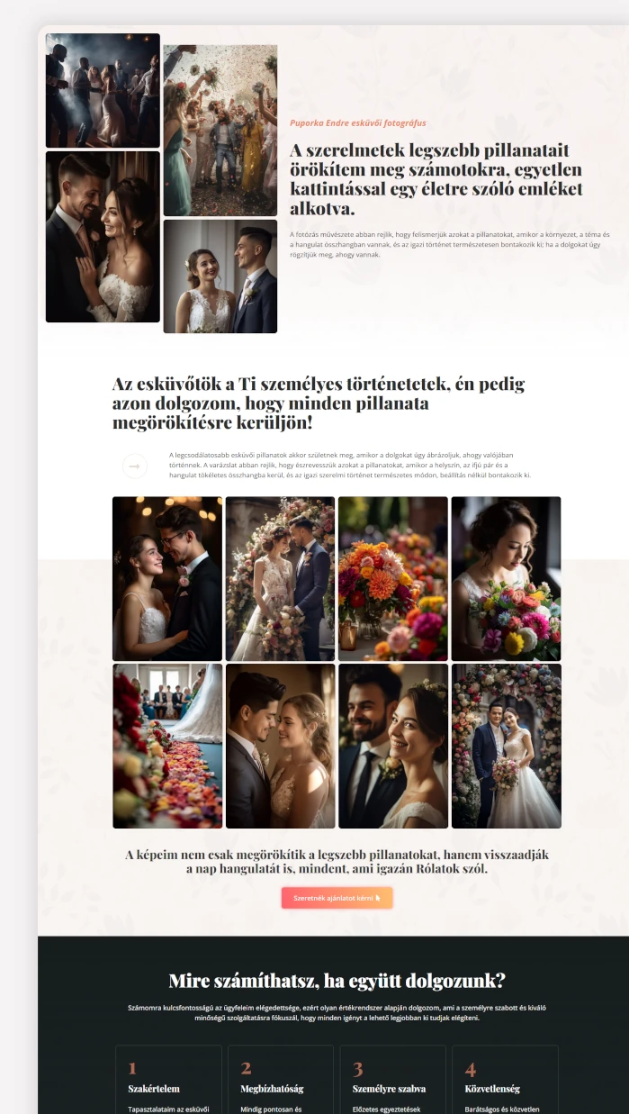 Egy fotós ügyfél kérésére célzott, kampányra optimalizált landing oldal készült, amely hatékonyan tereli a látogatókat az ajánlat megismerésétől egészen a kapcsolatfelvételig.